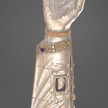 La vénération des restes corporels et matériels du Christ, de la Vierge et des saints est une spécificité du christianisme. Attesté dès l'époque paléochrétienne, le culte des reliques atteint son apogée au Moyen Âge. Les reliques sont conservées dans des reliquaires de formes très variées, la forme la plus classique et la plus répandue étant la châsse. Les reliquaires de forme anatomique suggèrent par leur apparence la nature de la relique qu'ils contiennent : tête, bras, pied, doigt… Ici ce bras-reliquaire présente, dans un geste de bénédiction, la relique de saint Christophe comme l’indique le parchemin visible dans le fenestrage. L’ensemble est formé d’une âme de bois recouverte de plaques d’argent. Deux vêtements couvrent cet avant-bras. On distingue la manche d’une aube serrée au poignet par un galon d’orfroi que recouvre la manche d’une dalmatique. Les bords des vêtements sont soulignés par des filigranes ornés de pierres précieuses et de deux intailles montées en bâte.