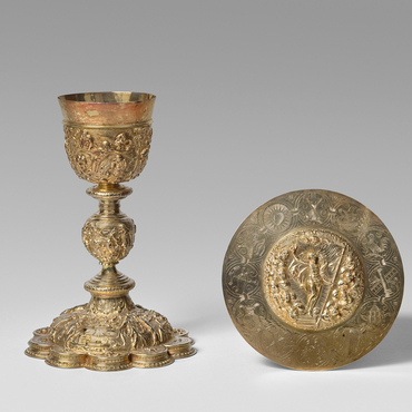 Ce calice au riche décor repose sur un pied polylobé mouluré. La base est ornée de rais de cœur et de losanges. Sur les lobes alternent des anges ailés et des compositions de fruits et de fleurs. Sur le pied bombé et circulaire ont été représentées trois scènes de l’Ancien Testament. Le choix des scènes s’est porté sur une mise en perspective de l’Ancien et du Nouveau Testament. Les scènes du Sacrifice d’Isaac, de la Pâque juive et de Moïse faisant jaillir l’eau du rocher sont séparées par un arbre feuillu. Sur la fausse-coupe, trois scènes du Nouveau Testament scandées par un arbre feuillu ont été représentées : l’Adoration des bergers, la Cène et la Crucifixion. Pour reproduire de telles scènes, les orfèvres manifestent une grande maîtrise technique car ils reproduisent parfois ou adaptent des gravures réalisées d’après des compositions peintes. Le haut du pied est élégamment orné de feuilles d’acanthe. Le nœud ovoïde est encadré de deux collerettes décorées de feuilles d’acanthe. Les quatre évangélistes accompagnés du lion, du taureau, de l’aigle et d’un ange sont représentés sur le nœud. La coupe unie est évasée.