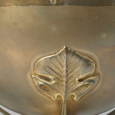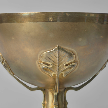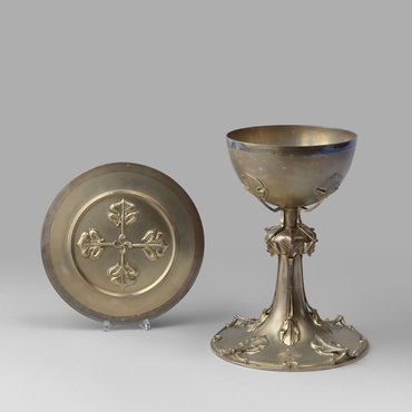 Très bel exemple de l’Art nouveau, cet ensemble illustre à merveille le thème de la nature cher à ce mouvement apparu à la fin du XIXe siècle. Le pied, la tige, la coupe et la patène sont ornés de feuilles stylisées. Les lignes épurées et la sobriété du décor confèrent à cet ensemble une certaine élégance. L’orfèvre s’est ici libéré du style néogothique si présent à la fin du XIXe siècle.