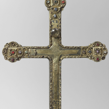 Près de la main droite du Christ se trouve une petite porte niellée servant probablement à introduire des reliques et sur laquelle est dessinée une femme voilée que l’on suppose être la Sainte Vierge. Les traits de la figure sont presque effacés. Au-dessus du Christ se trouve une seconde forme carrée et niellée représentant un personnage à mi-corps, vêtu de la toge romaine, les deux mains levées, tenant dans l’une une croix, dans l’autre un disque ou un globe. Aux extrémités des croisillons figurent des quatrefeuilles comportant une décoration de filigranes et pierres gravées. Cinq médaillons niellés entrent dans la décoration du revers de la croix. L’un au centre représente l’Agneau divin portant la croix, les quatre autres aux extrémités des croisillons montrent le tétramorphe. Six cristaux oblongs laissent voir des reliques. Une longue inscription, dont les caractères sont niellés, court le long de la tranche de la croix : elle énumère toutes les reliques qui y sont renfermées.