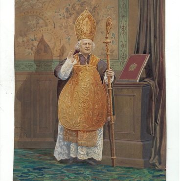 Une gouache peinte sur carton par E. Beaudouin nous montre Mgr Boudinet revêtu de ses ornements pontificaux, portant cette crosse (Amiens, Archives diocésaines, DA 446).