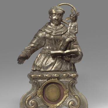 Saint Antoine de Padoue, de l’ordre de saint François, fut canonisé en 1232 et déclaré docteur de l'Église en 1946. Il est ici représenté vêtu de la bure franciscaine nouée par une cordelière à trois nœuds rappelant les trois vœux de pauvreté, de chasteté et d’obéissance. Il tient un exemplaire de l’Évangile. L'Enfant Jésus lui caresse la joue.